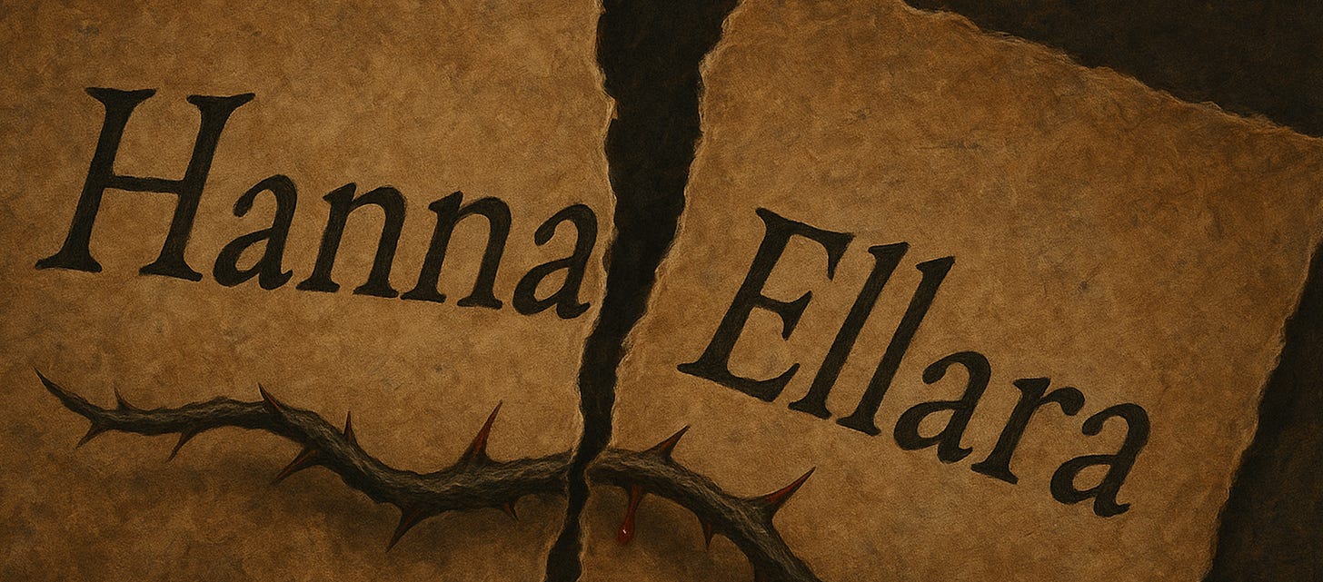 "No." Nori continues in her normal emotionless tone, "A spy report has just landed on Riko's desk that details who Garrick's human is. They've listed Hanna Linwood and Ellara Fellmark as her aliases."
