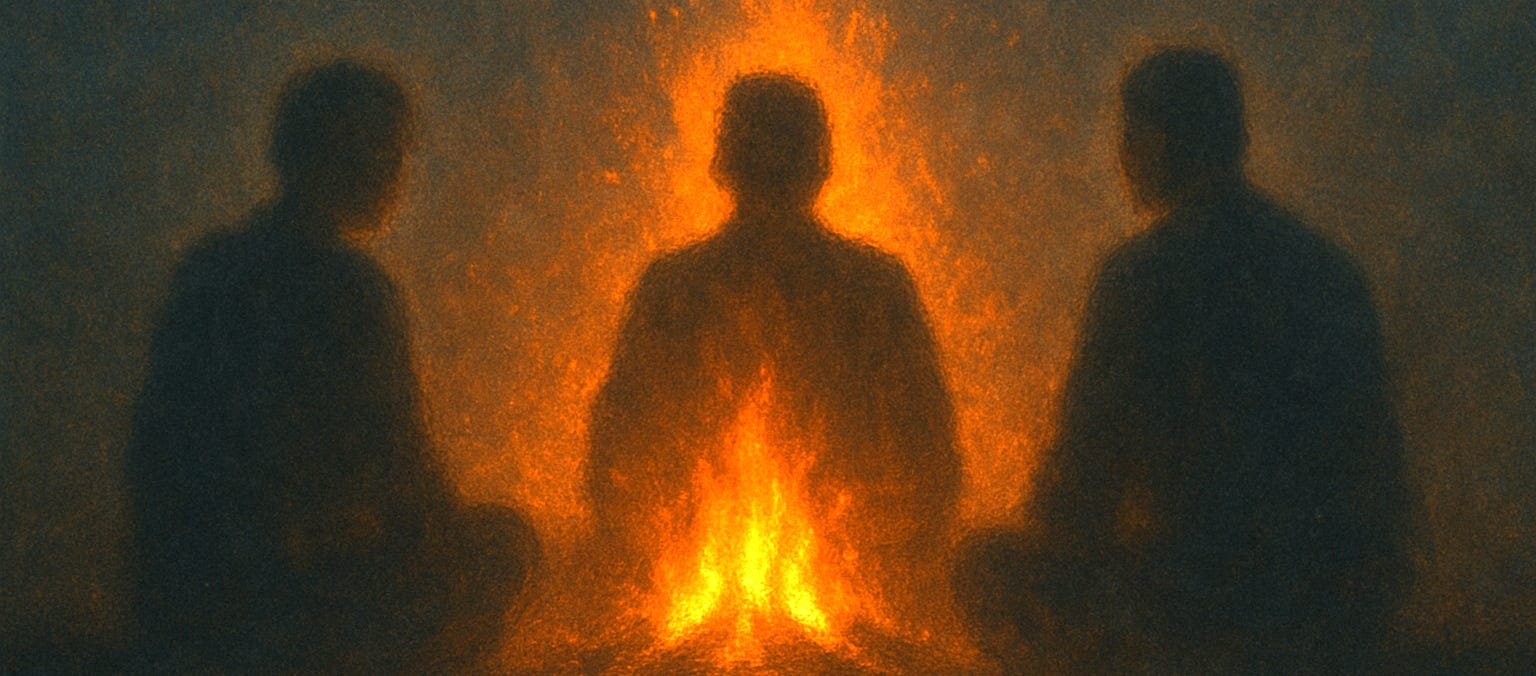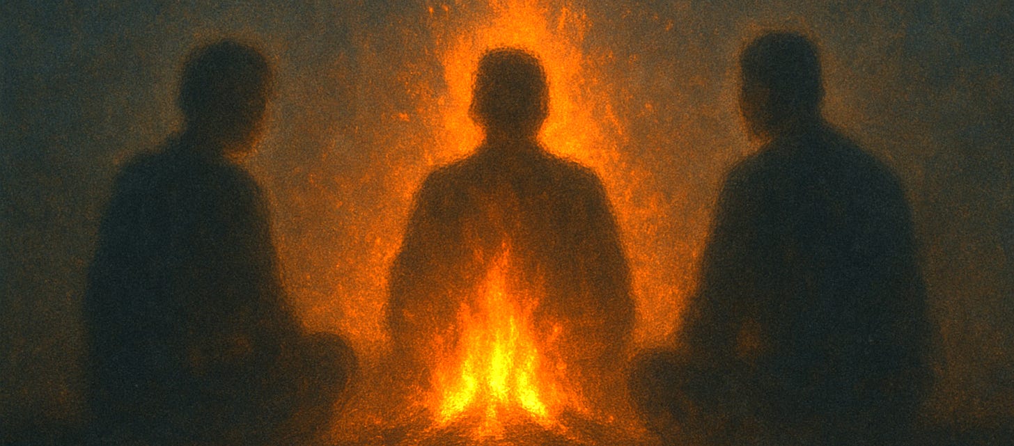 Mulsae doesn't answer at first. He sits there, breathing. His eyes are open but unfocused, fixed somewhere far beyond the firelight. Damion's hand still rests on his shoulder. Hanna waits and doesn't press.